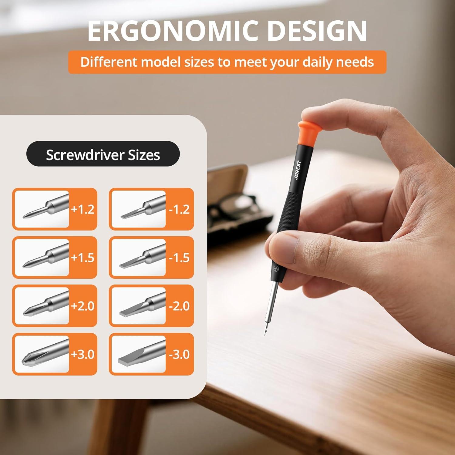 【Eight Types of Stainless Steel Eyeglass Screwdrivers】The set for repairing eyeglasses has 8 precision screwdrivers(both Phillips and flathead)in various sizes:1.2mm,1.5mm,2.0mm,3.0mm. The tail can rotate 360⁰, which is flexible and labor-saving. The handle is anti-slip and high compatible with the screws. What you should notice is that the material of our screwdriver is stainless steel, so it does not have magnetic attraction function, but it is rust resistant and has a longer service life.