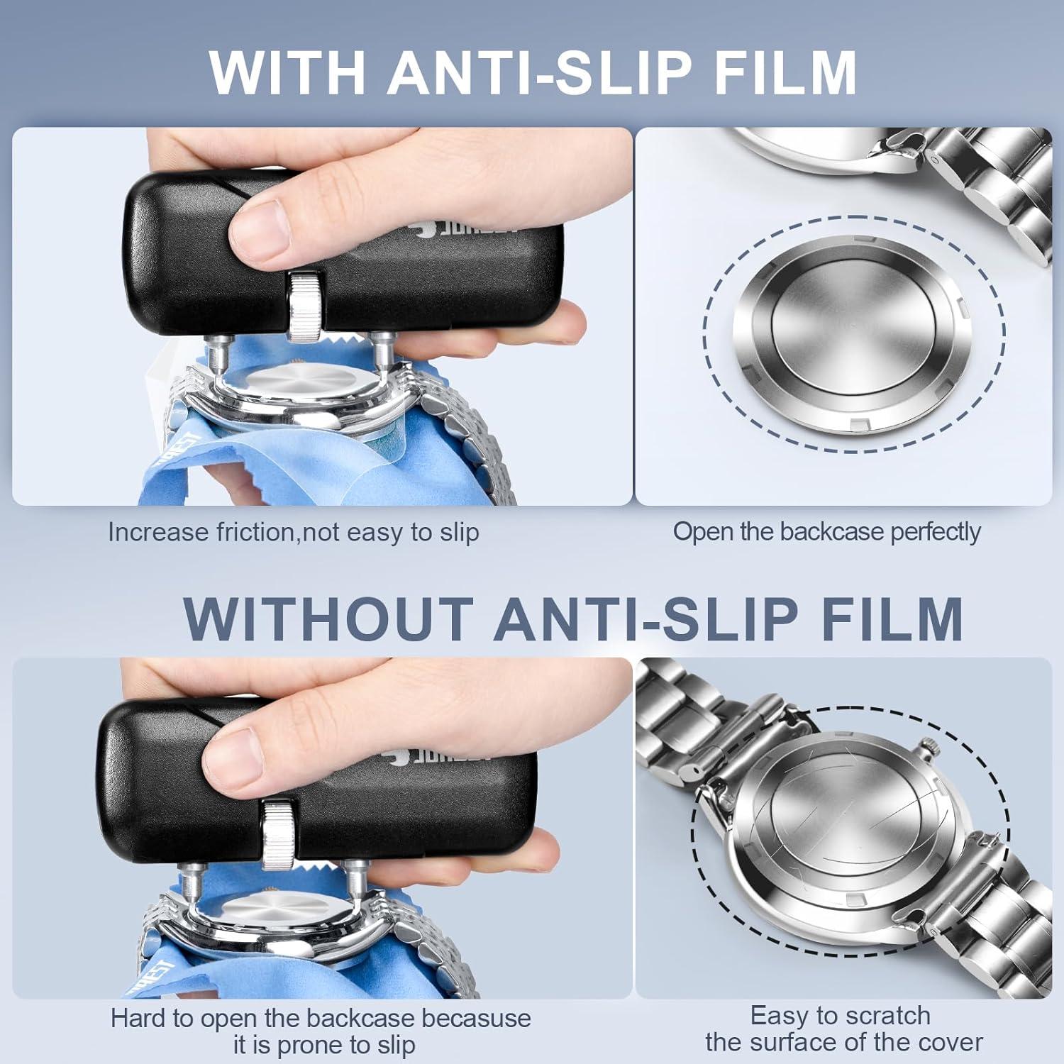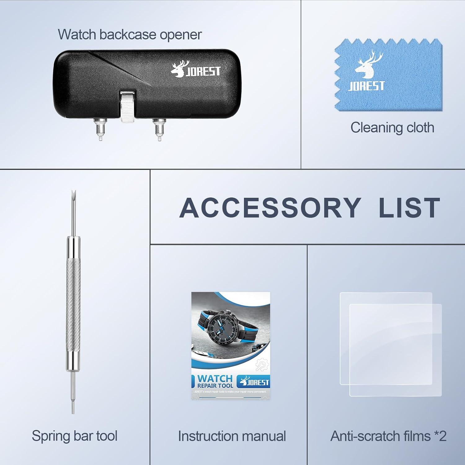This kit consists of a watch cover opener, a spring bar tool, two anti-scratch films and a cleaning cloth. It can help you perform various operations such as opening the watch back, changing the watch battery and replacing the watch band.